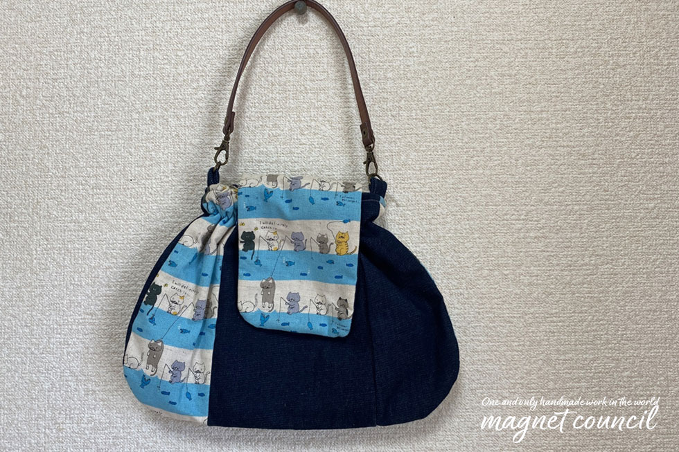 ねこちゃん柄が可愛いです。 ちょっとしたお出かけにオススメのバッグ。 形も変わっていて個性的! 入れ口がキュっとなっていて、 落下もしにくそうです!
